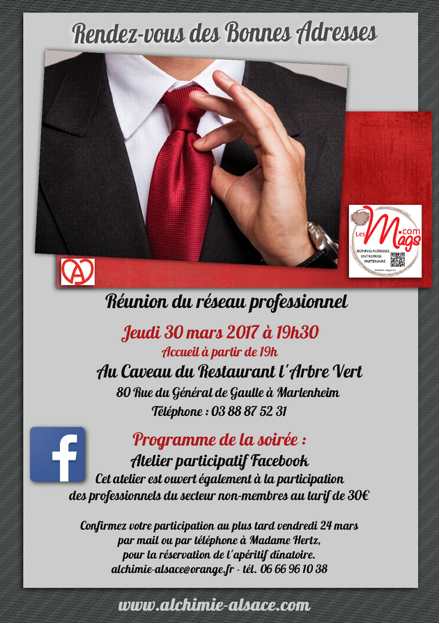 Veuillez confirmer votre présence à Mme Hertz, au plus tard vendredi le 24 mars, par mail à alchimie-alsace@orange.fr ou par téléphone au 06 66 96 10 38.